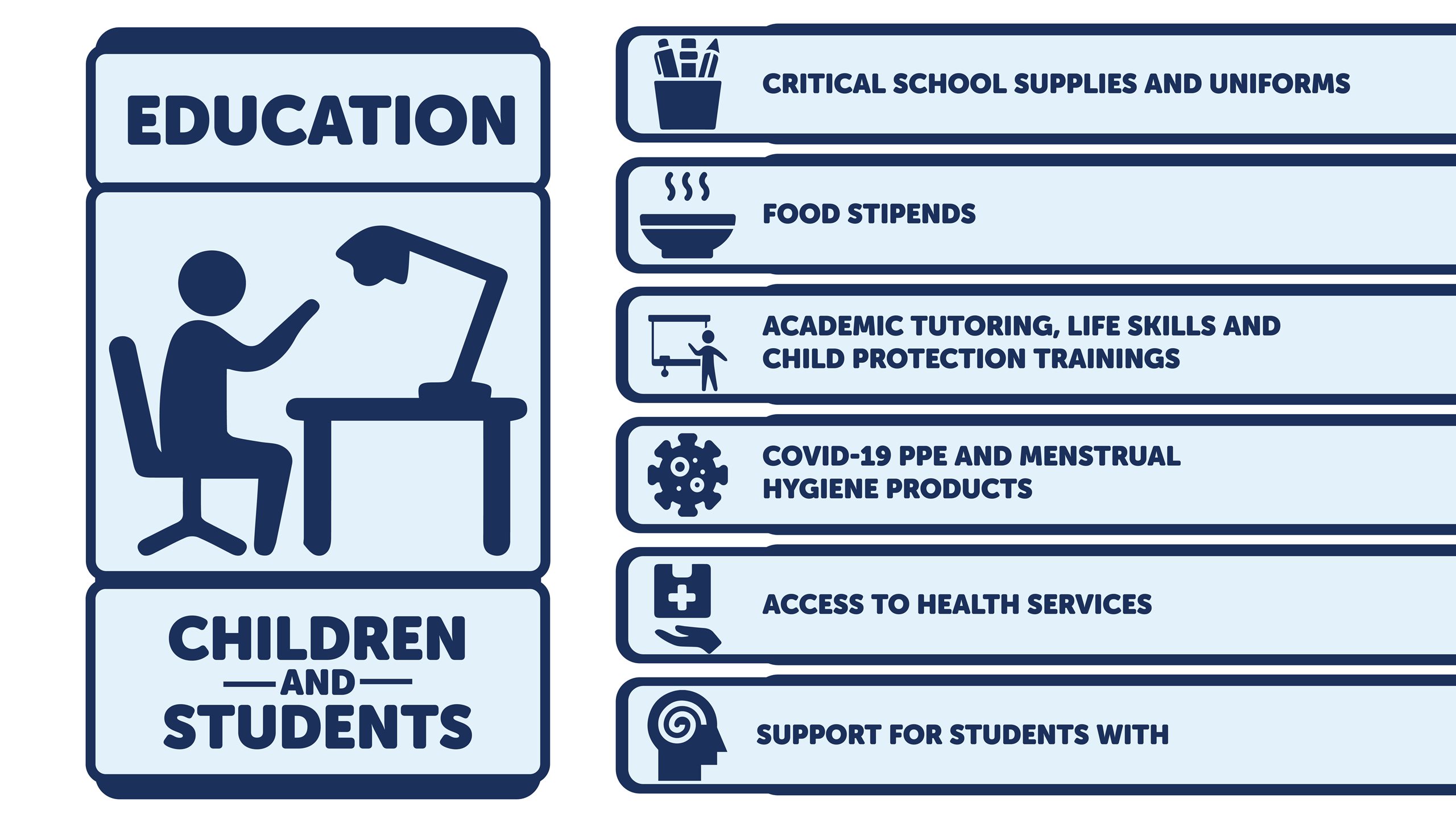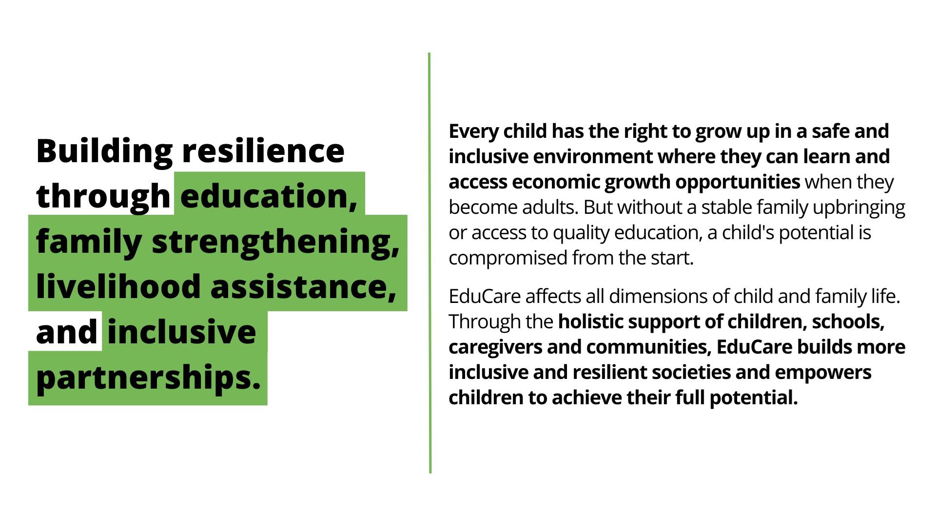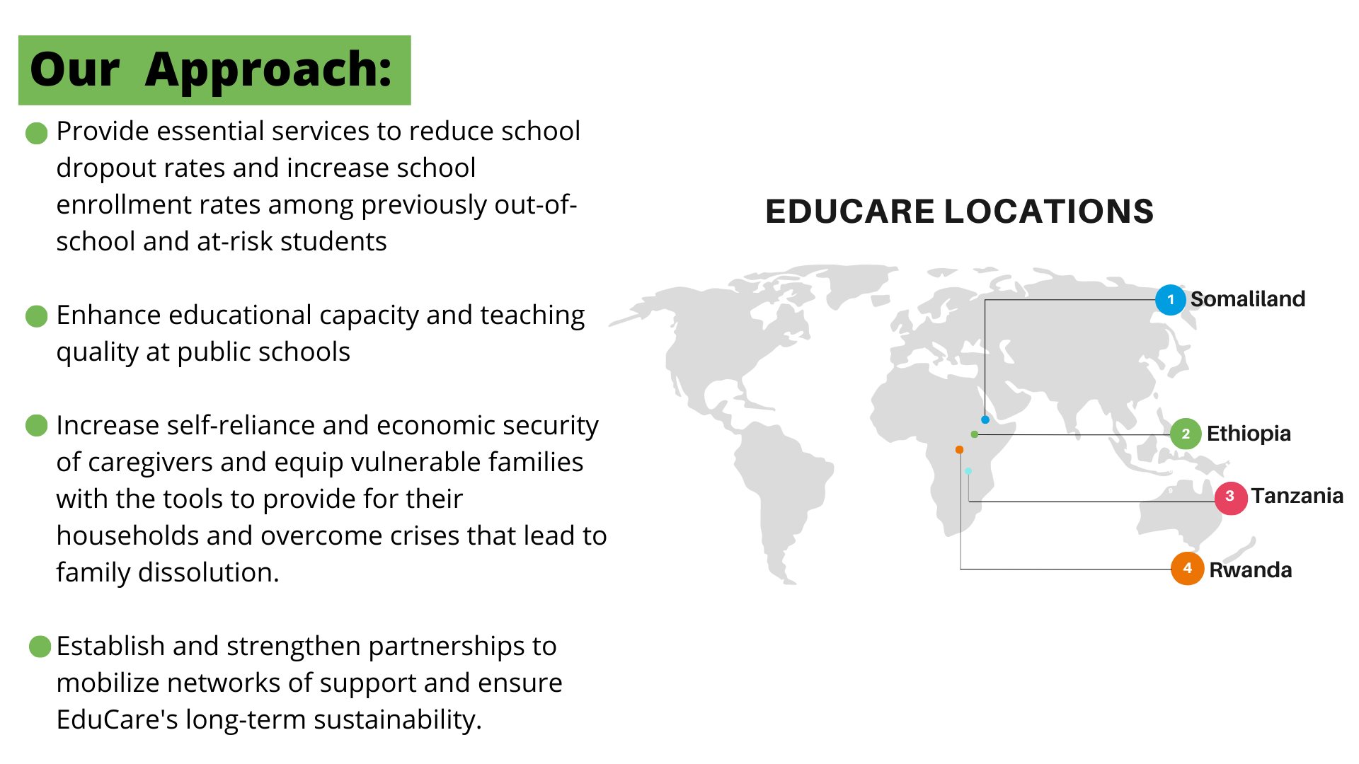Partnership is vital to our work. Strategic investments in EduCare empower thousands of vulnerable children and families every day. Together, we can grow EduCare’s impact in regions beyond East Africa. The program’s holistic approach can be adapted to specifically address numerous key global issues and geographic focus areas.